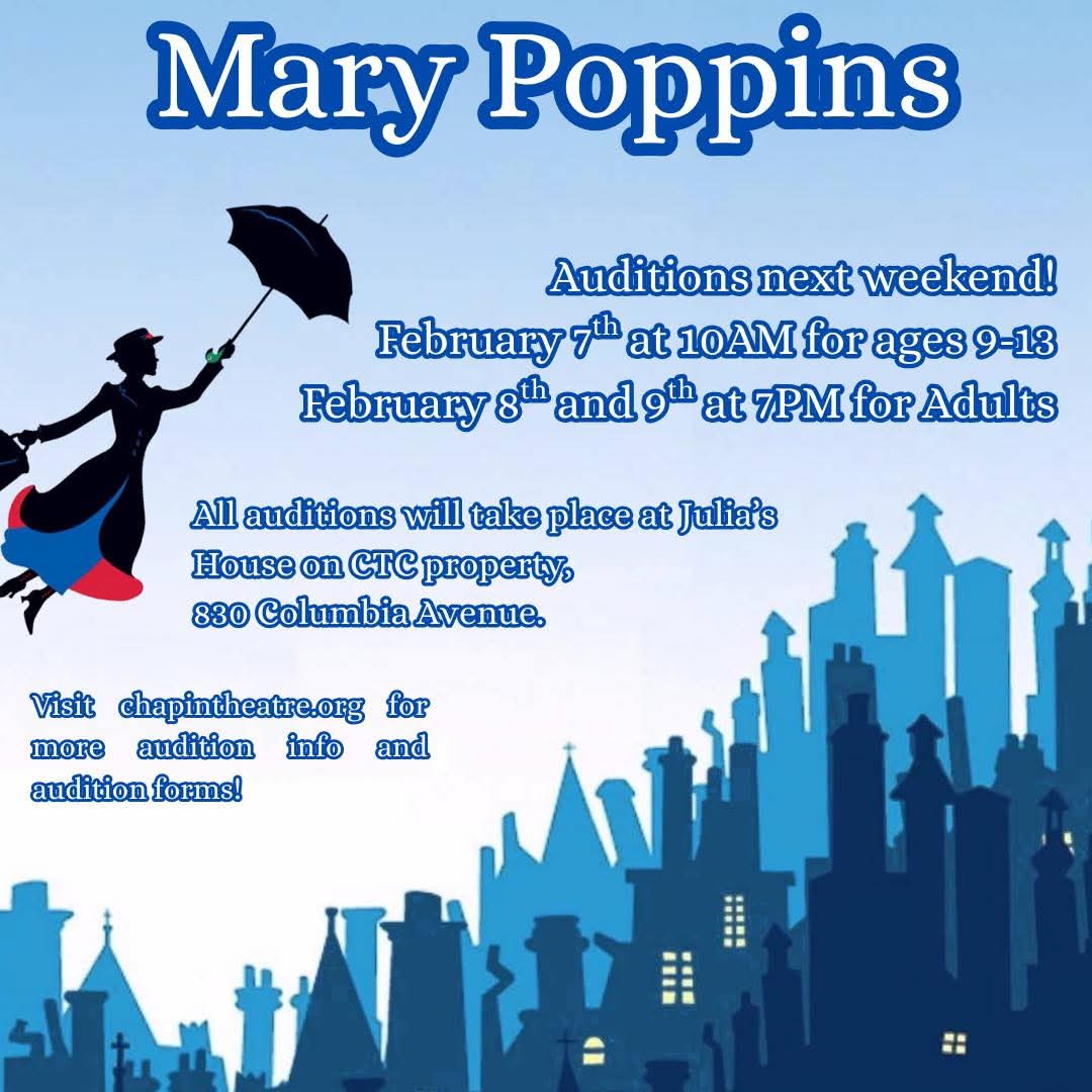 NOTE: If you cannot make a scheduled audition date for Mary Poppins, you can send in a video audition. It needs to be sent to Tiffany.ChapinTheatre@gmail.com by Feb 7th.