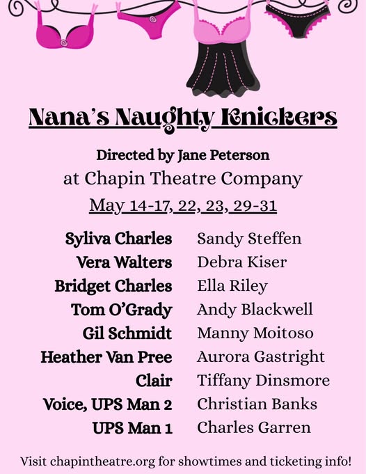 We’re tickled pink to announce the freshly cast production of Nana’s Naughty Knickers, directed by Jane Peterson! Written by Katherine DiSavrio, Nana’s Naughty Knickers follows the young woman Bridget, who is planning to stay with her grandmother for the summer before law school starts. However, what Bridget sees as a unique opportunity to stay with her favorite “Nana” in New York for the summer quickly turns into an experience she’ll never forget. It seems her sweet Nana is running an illegal boutique from her apartment, selling handmade naughty knickers to every senior citizen in the five-borough area! Will Bridget be able to handle all the excitement? Will her Nana get arrested – or worse – evicted? Performance dates for Nana’s Naughty Knickers will be May 14 - 31, 2026 at Chapin Theatre Company. Tickets on sale April 1 for members and April 15 for the general public!